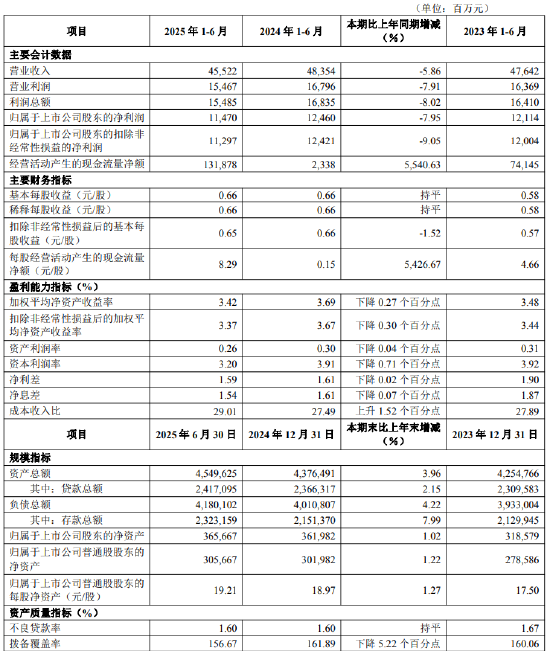 8月28日金融一线消息,今日发布2025年半年度报告。数据显示,截至报告期末,集团资产总额45496.25亿元,比上年末增加1731.34亿元,增长3.96%;贷款总额24170.95亿元,比上年末增加507.78亿元,增长2.15%;存款总额23231.59亿元,比上年末增加1717.89亿元,增长7.99%。