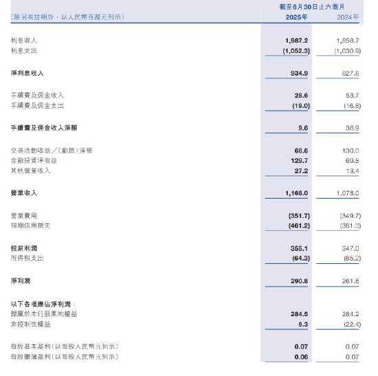 8月28日金融一线消息,中原银行发布截至2025年6月30日止六个月之中期业绩公告。数据显示,该集团取得净利息收入人民币9.35亿元,同比增加12.94%;营业收入11.68亿元,同比增加8.35%;净利润2.91亿元,同比增加11.08%;归属于本行股东的净利润2.85亿元,同比持平;每股基本盈利0.07元。