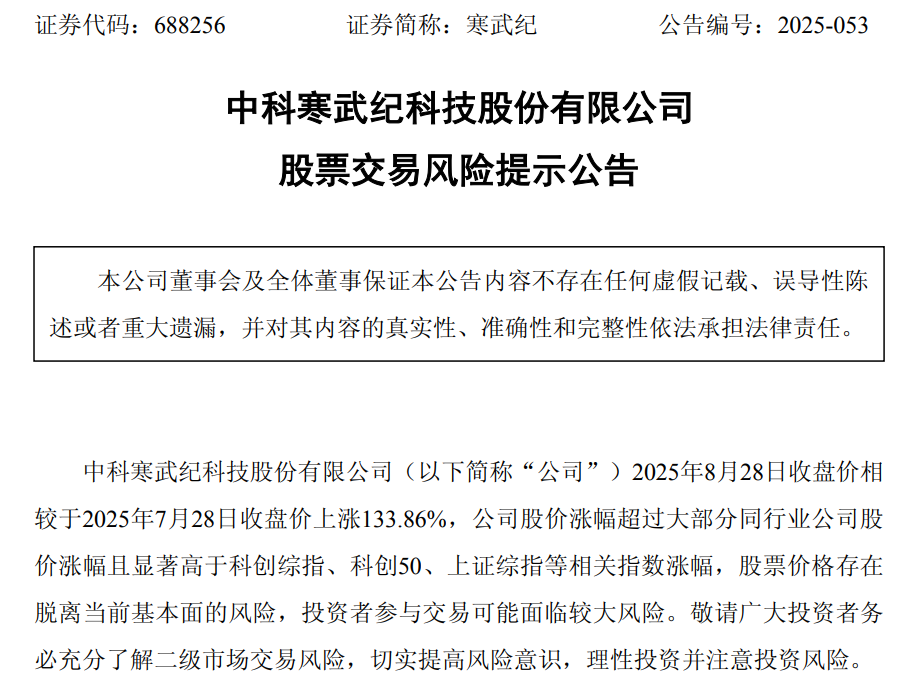 8月28日晚间,刚刚登上A股“股王”宝座的寒武纪,发布了股票交易风险提示公告。