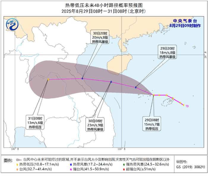 受南海热带低压影响,29日至30日,广东西南部、广西南部、海南岛等地部分地区有大到暴雨,其中,广东西南部、海南岛北部和东部等局地有大暴雨;南海大部、中沙群岛、西沙群岛、南沙群岛和黄岩岛附近海域、北部湾、琼州海峡、广东沿海、广西沿海、海南岛沿海有6~7级大风,其中海南岛南部和东部近海、广东中西部近海风力有8级,阵风9~10级,部分海域风力达9级,阵风10级。