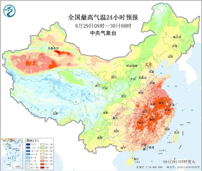 高温方面,预计29日白天,黄淮至江南及新疆*盆地、南疆盆地等地仍有大范围高温天气,其中,安徽南部、江苏南部、湖北东部、湖南东部、江西大部、浙江中北部、重庆中部、新疆*盆地和南疆盆地等地部分地区更高气温可达37~39℃,局地超过40℃。