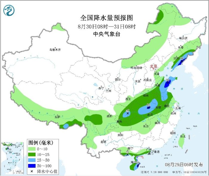 黄淮至东北有降雨天气。29日至9月1日,黄淮、江淮、江汉、江南北部、四川盆地、东北等地先后有小到中雨或阵雨,其中,山东中东部、安徽北部、江苏中北部、湖北东部、辽宁东部、吉林东部等地部分地区有大到暴雨,局地有大暴雨,并伴有短时强降水,局地有雷暴大风等强对流天气。