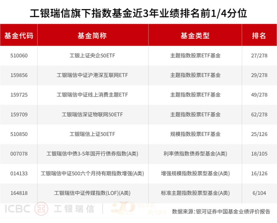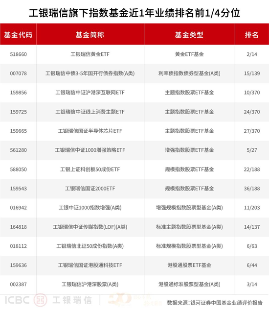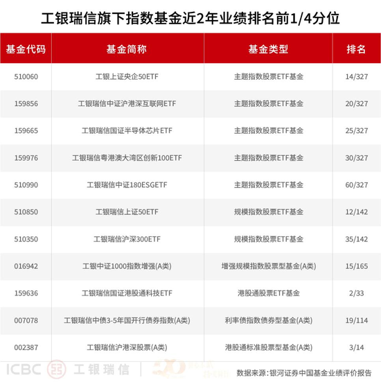近年来,被动投资凭借多重优势特征,正成为投资者进行资产配置不可或缺的一环。工银瑞信在指数及ETF业务上精准施策,不仅产品线日益丰富完善,致力于为投资者提供高效、透明、跟踪精准的市场贝塔捕捉工具。银河数据统计显示,截至6月30日,工银瑞信基金旗下共有22只产品在近一年、近两年、近三年和近五年等不同区间中位居同类前1/4,核心宽基与行业主题赛道上多点开花。