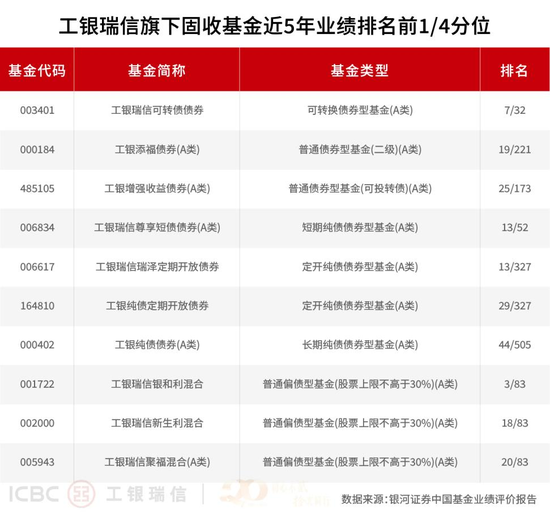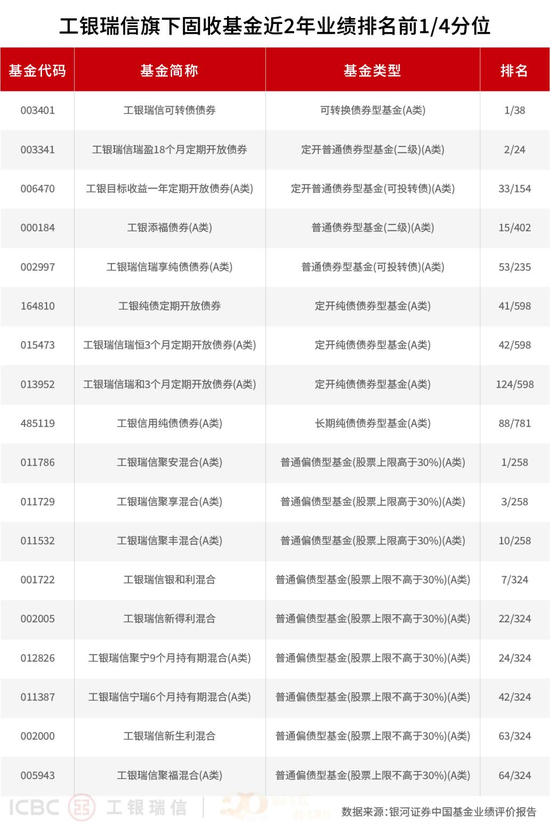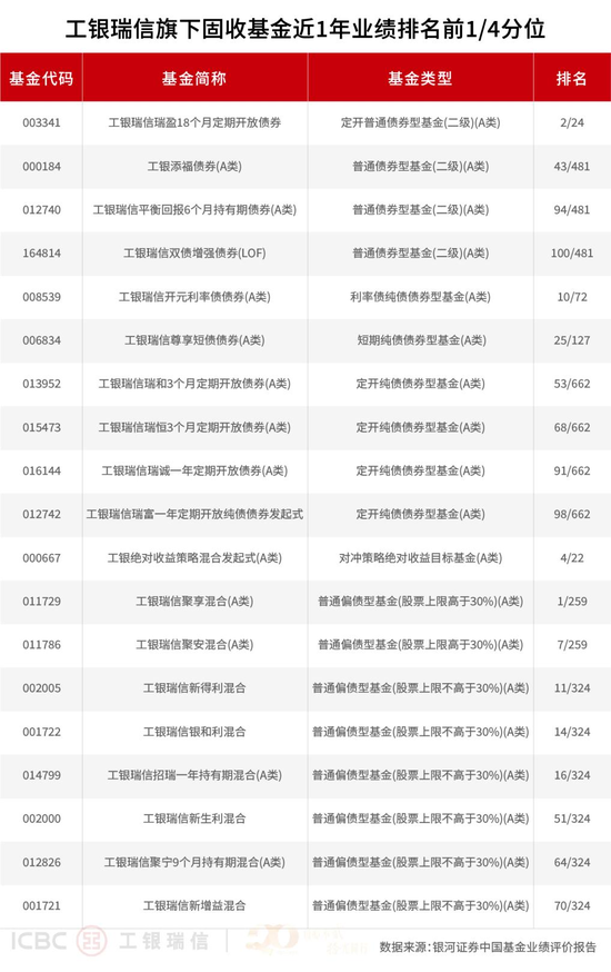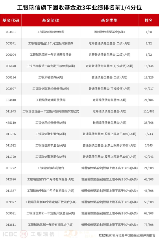 在纯债投资提供安全边际的基础上,工银瑞信积极拓展“固收+”领域,努力在控制波动和回撤的前提下获取增强收益。银河证券业绩数据生动地印证了其在“固收+”不同细分策略上的突出表现。在追求收益弹性的二级债基、可转债基金及偏债混合型基金阵营中,不乏表现抢眼的冒尖产品。银河证券数据显示,近一年,工银聚享混合A名列同类之一(1/259),工银瑞盈18个月定期开放债券名列同类第二(2/24),工银银和利混合、工银新得利两只偏债混合型基金业绩表现均名列同类产品前1/10(14/324、11/324)。