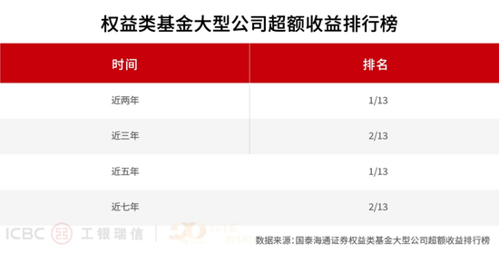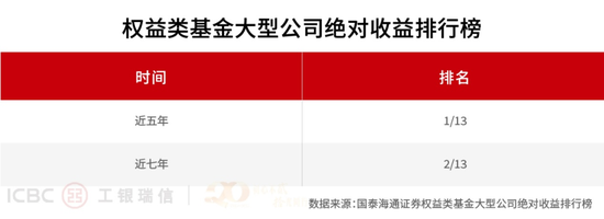 整体来看,根据证券发布的基金公司权益类资产业绩排行榜单数据,截至2025年上半年末,工银瑞信旗下主动权益基金近五年、近七年的绝对收益,在13家权益类大型公司中分别位列之一和第二;超额收益率近五年、两年居之一,近七年、三年居第二。这份跨越周期的成绩单,是工银瑞信主动权益投资核心实力的有力注脚。
