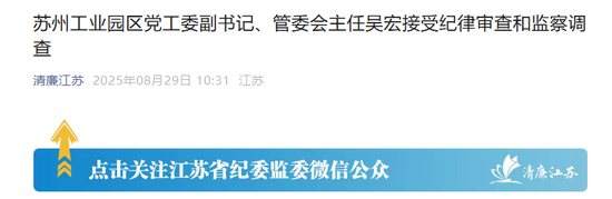 据江苏省纪委监委官方号“清廉江苏”8月29日消息,苏州工业园区党工委副书记、管委会主任吴宏涉嫌严重违纪违法,目前正接受江苏省纪委监委纪律审查和监察调查。