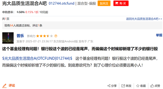 基金业绩下降,有基民表示,这个基金经理有问题!银行股这一波已经是尾声,而偏偏这个时候却新增了不少的银行股。到底意欲何为?到了心理价位必须要远离小人!有基民在帖子下面回应,基金经理这节奏感,怕不是要站岗了。也有基民表示,搞不懂这个基金经理为什么高位接盘,低位割肉。