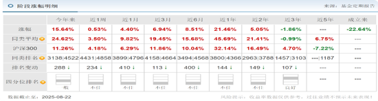 笔者发现,该基金在2025年2季度买入562.34万股的,然而,中国银行股票价格已经在高位,在该基金持有期间,在2025年4月1日-2025年8月22日股票价格下跌2%,要是股票价格继续下跌,那对基金净值也会造成影响。