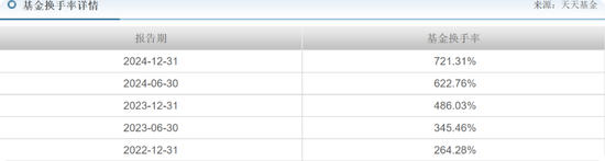 笔者还发现,该基金的换手率极高,在基金换手详情里,换手率没有低于100%,5个季度里更高的是2024年4季度换手率高达721.31%,2024年2季度换手率也高达622.76%,更低的一次换手率也高达264.28%。高换手率意味着频繁交易,这会导致投资组合的波动性增加。频繁买卖股票使得基金的持仓结构不断变化,难以形成稳定的投资组合。