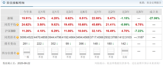 笔者发现,该基金在2024年3季度买入28.26万股的,2024年4季度持有4.24万股,到了2025年1季度已经没有了此前购买的股票份额。然而,在该基金持有期间,在2024年7月1日-2025年3月31日股票价格下跌了5%。
