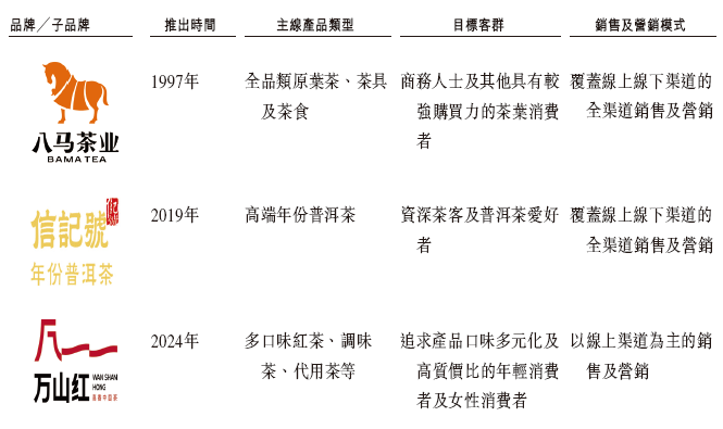 八马茶业拥有覆盖中国主要的六大茶类的全品类茶产品体系的核心品牌八马,子品牌信记号专注提供高端年份普洱茶,子品牌万山红则专注于提供迎合追求口味多元化及高质价比的年轻消费者及女性消费者的产品。八马品牌自2010年起获中国国家工商行政管理总局商标局确认为‘中国驰名商标’,信记号子品牌自2024年起被商务部、文化和旅游部、国家市场监督管理总局、国家知识产权局及国家文物局认定为中华老字号。