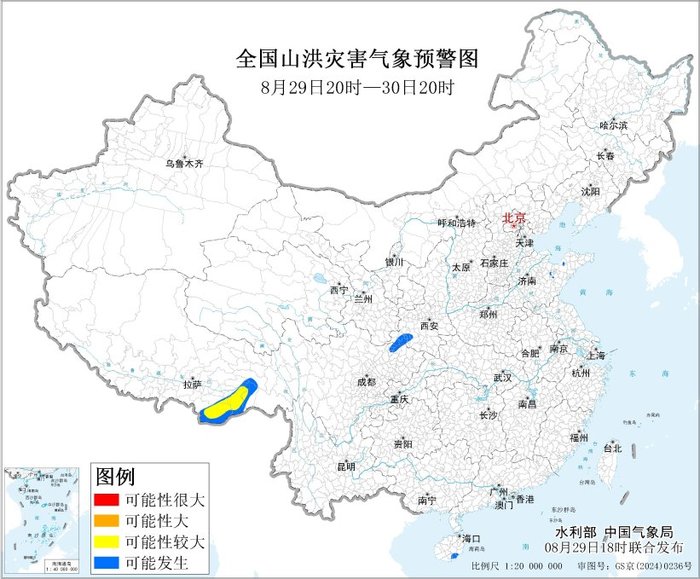 水利部和中国气象局8月29日18时联合发布黄色山洪灾害气象预警: