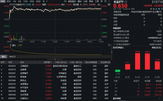 吃喝板块今日(8月29日)全线爆发!反映吃喝板块整体走势的食品ETF(515710)开盘急速上攻,盘中场内价格猛涨3%,收盘仍大涨2.52%,行情火热!龙头个股集体上扬,、强势领涨超7%,、跟涨超6%,、、、、等白酒龙头全线飘红!