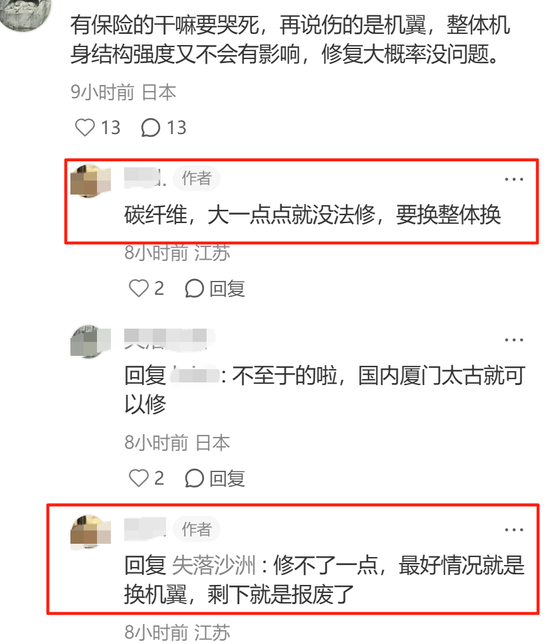 看他的意思,机身、机翼等是一个碳纤维的整体,稍微碰一下,就算只是伤到蒙皮,也得全换新的,还不如报废。