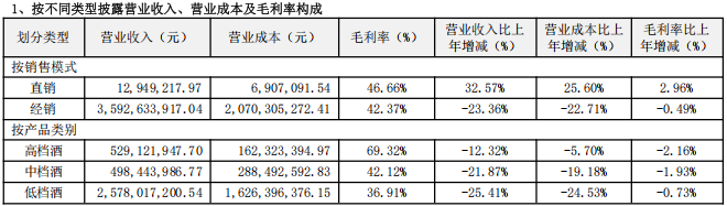 其中,高端产品(50元/500ml以上)营收5.29亿元,同比下降12.32%,毛利率69.32%,同比下降2.16%;中档酒(10~50元/500ml)营收4.98亿元,同比下降21.87%,毛利率42.12%,下降1.93%;低档酒(10元/500ml以下)营收25.78亿元,同比下降25.41%,毛利率36.91%,下降0.73%。