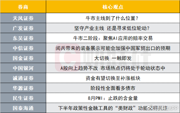 配置机会:成长板块上半年展现出较高景气度,随着产业趋势积蓄向上,更多景气线索聚集有望形成轮动主线;中长期视角下供需格局改善与行业盈利修复带动“反内卷”概念,关注基础化工、建筑材料、光伏设备、电池等领域;估值具备安全边际的红利资产,配置逻辑依然清晰;政策呵护下的大消费领域具备投资价值,商务部表示将于9月出台扩大服务消费的若干政策措施。