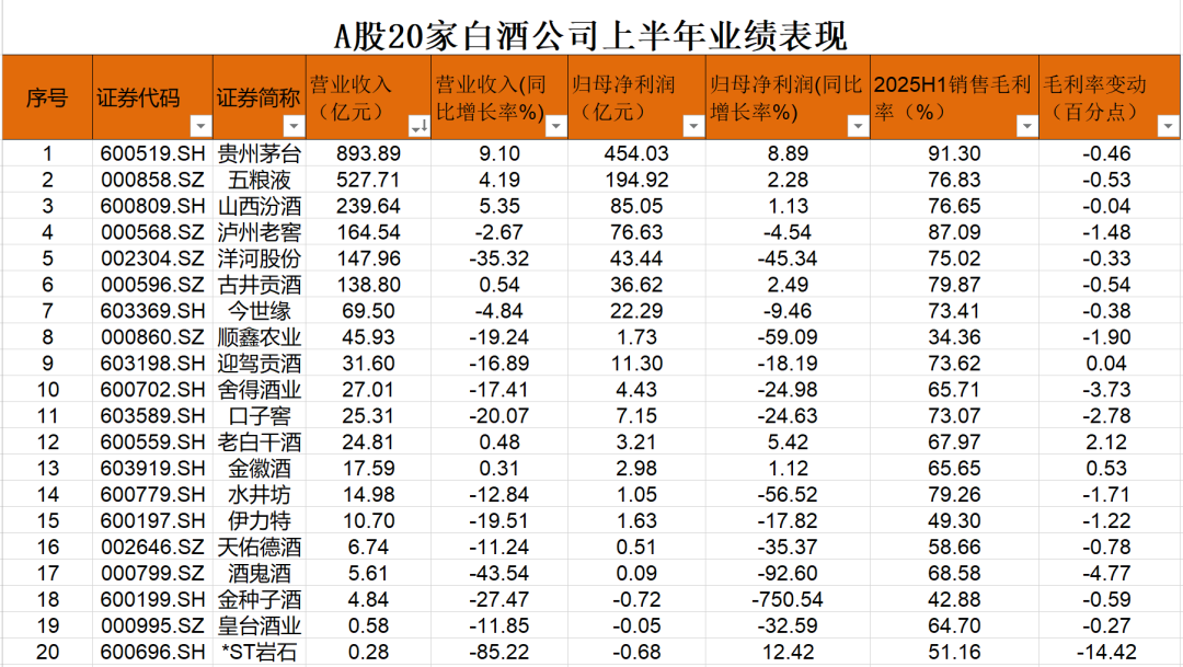 6家个位数增长、11家下滑、3家亏损……2025年上半年,20家A股上市酒企的业绩表现,让广大投资者直观地感受到了白酒市场的“寒意”。