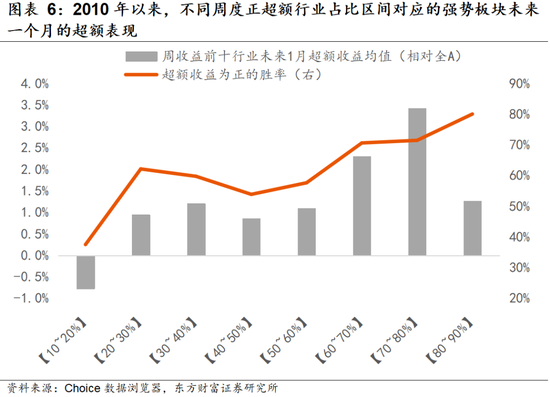 统计2010年以来,周度超额收益前10的申万二级行业在后续一个月的超额收益表现,我们发现三个规律: