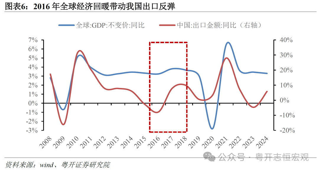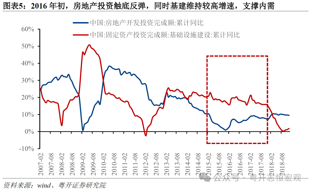供给侧改革时期,房地产经历去库存后进入上行周期,且全球经济回暖带动出口回升,需求仍有韧性。内需方面,2008年国际金融危机后,“四万亿” *** 计划提振了经济,但是随着“四万亿”等宏观 *** 政策逐渐退坡,需求趋于回落,房地产进入去库存周期。2015年之后,随着棚改货币化安置等政策实施,房地产库存去化加快。2016年初房地产投资触底反弹,房地产市场进入上行周期。同时,基建投资维持了约15%-20%的较高增速,与房地产共同对内需形成有效支撑。外需方面,随着2008年国际金融危机和2012年欧债危机的冲击逐步消退,2016年全球经济开始复苏,外需回暖带动中国出口增速大幅反弹,2017年我国出口同比增长7.9%,增速比上年提高15.6个百分点。