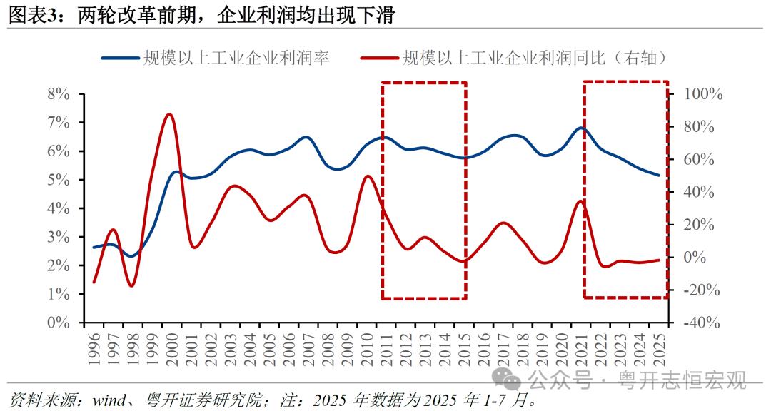 三是企业利润下滑。受需求回落、价格下跌等因素影响,企业利润出现下滑。供给侧改革时期,2015年工业企业利润同比下降2.3%,是1998年以来的首次负增长;同年工业企业利润率下滑至5.76%,创2009年以来新低。反内卷时期,工业企业利润自2022年开始负增长,2025年前7个月同比下降1.8%;2025年前7个月工业企业利润率下滑至5.15%,低于供给侧改革时期,且创2001年以来新低。