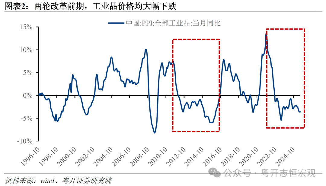 二是工业品价格大幅下跌。供给侧改革时期,产能过剩领域库存积压,厂商纷纷降价竞争, PPI从2012年3月起陷入长达54个月的负增长,持续时间创历史纪录。反内卷时期,PPI自2022年10月起陷入负增长,截至2025年7月已持续34个月。