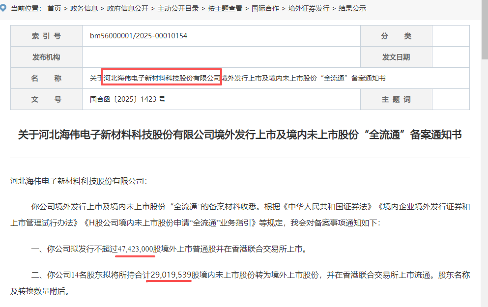 2025年8月26日,中国 *** 国际合作司发布关于河北海伟电子新材料科技股份有限公司境外发行上市及境内未上市股份“全流通”备案通知书(国合函[2025]1423号)。