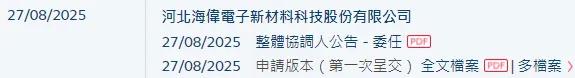 海伟电子新材料,于2025年2月26日、8月27日先后两次在港交所递交招股书,独家保荐。