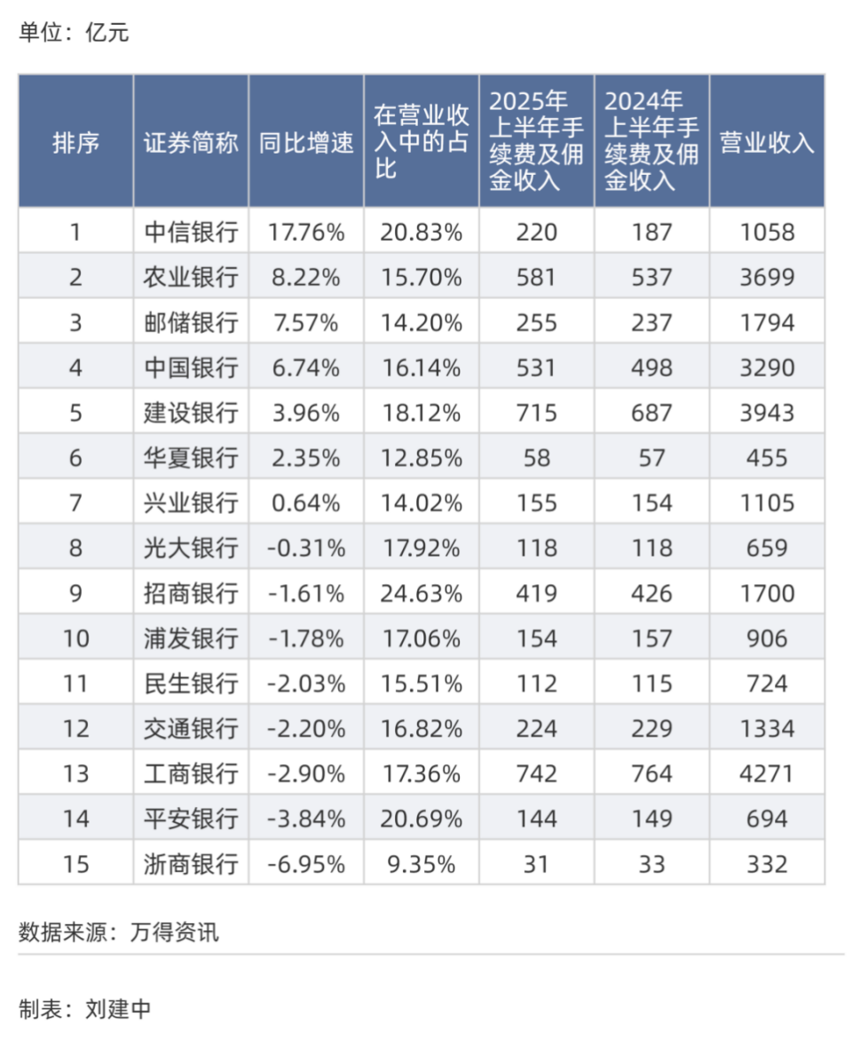 表2:国有大型银行和股份制银行的手续费及佣金收入增速与营收占比(2025年上半年)