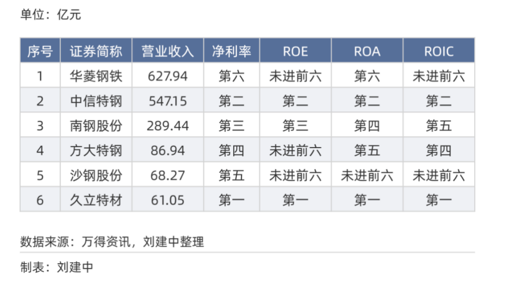 中信特钢和南钢股份的盈利质量在钢铁行业中居于前列。有四个指标可以从不同侧面衡量企业的盈利质量:销售净利率、净资产收益率(ROE)、总资产收益率(ROA)、投入资本回报率(ROIC)。