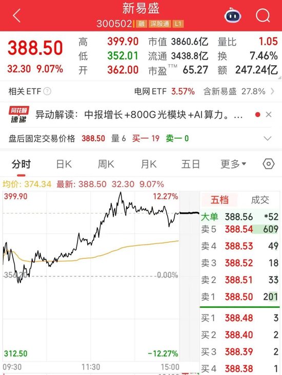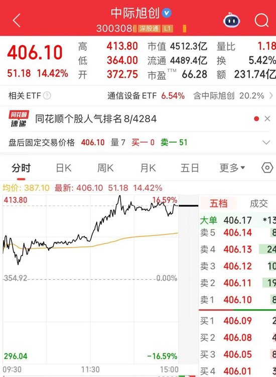 从盘面上看,CPO(光电共封装技术)概念午后拉升。“光模块双巨头”、股价大涨。截至收盘,中际旭创涨14.42%,报406.10元/股,股价首次突破400元;新易盛涨超9%,报388.50元/股,二者收盘价均创历史新高。