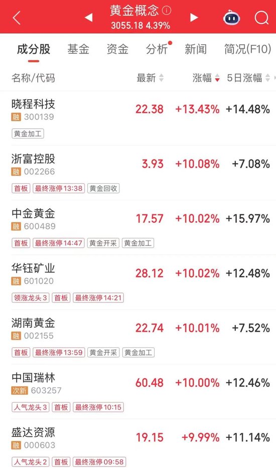 今天,黄金概念全天保持强势。黄金加工、黄金连锁零售商、黄金开采、黄金回收等细分领域联手上涨,浙富控股、中金黄金等个股批量涨停。此外,涨停。