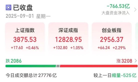 9月1日,大盘高开后呈现震荡态势。午后,创业板涨幅进一步扩大。截至收盘,上证指数涨0.46%、深证成指涨1.05%、创业板指涨2.29%。全市场成交约2.78万亿元,超3200只个股上涨。