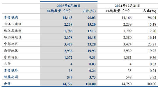 截至2025年6月末,建行有境内机构14,143个,包括总行、2个分行级专营机构、37个一级分行、362 个二级分行、13,730个支行及11个支行以下网点。