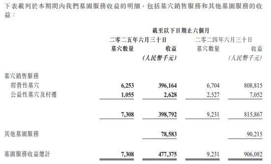 福寿园今年中期财报显示,亏的钱以“亿”为单位。截至2025年6月30日,上半年福寿园的收入总额约为6.11亿元人民币,与去年同期相比骤减了44.5%,其中大部分亏损源自福寿园的核心业务——墓园服务,其收入从2024年同期的9.06亿元暴跌至4.77亿元。