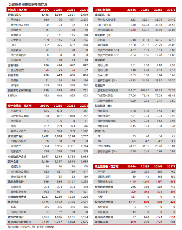 我们预计公司2025-2027年实现营收19.39、26.91和36.19亿元,同比变化+33.9%、+38.8%和+34.5%;实现归母净利润3.95、5.59、7.61亿元,同比变化+57.9%、+41.6%和+36.1%。当前股价对应2025-2027年市盈率分别为48、34、25倍,考虑公司积极推进新产品满足客户多元化需求,维持“推荐”评级。
