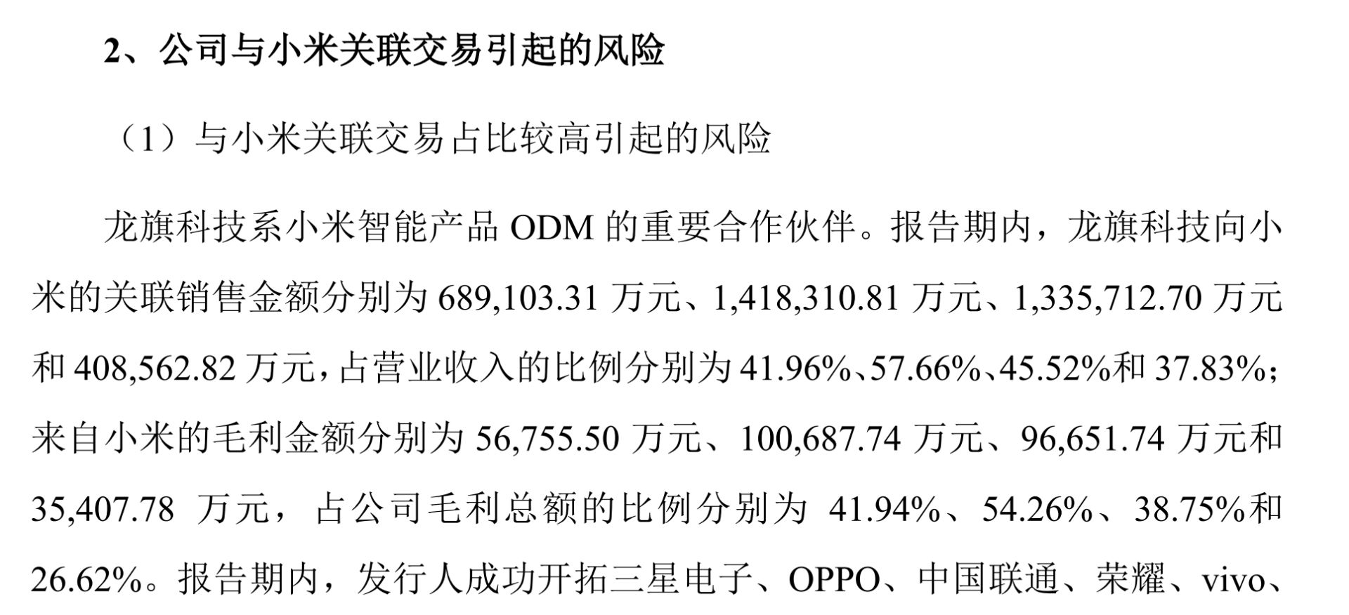 龙旗科技表示,若小米未来经营情况或采购策略发生变化,进而导致向公司的采购金额显著下降,公司的业务和经营业绩将受到重大不利影响。