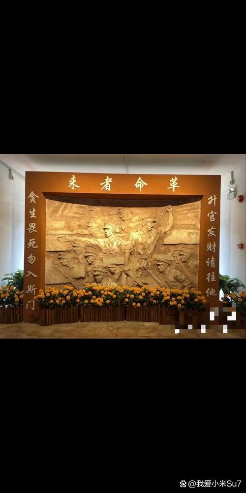 序厅正中的主题雕塑中,有的人拿着枪,有的举着旗,有的握着拳。
