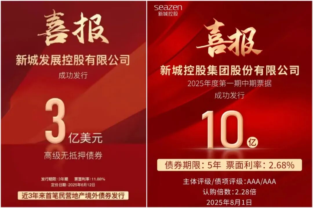 此外,新城控股也在通过发债融资。今年6月,公司成功发行3亿美元无抵押境外债。两个月后,公司发行10亿元中期票据,并且以2.68%的票面利率,创下了国内发债利率的新低,两笔融资稍许环节公司燃眉之急。