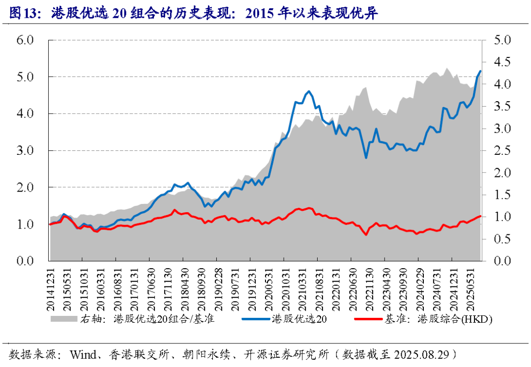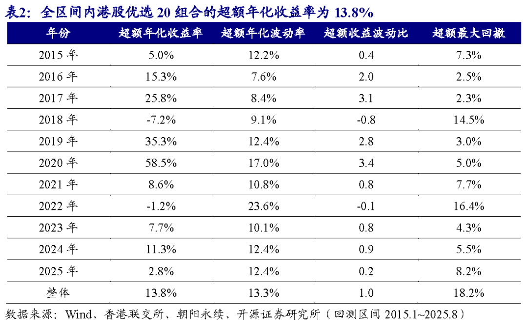 从全区间来看(2015.1~2025.8),港股优选20组合的超额年化收益率13.8%,超额收益波动比为1.0。
