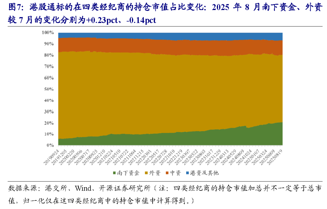 我们将港股通成分股(共555只)通过香港联交所的持股明细进行资金流估算,并按照资金流的机构来源,分成四类托管机构:南下资金、外资、中资和港资及其他。截至8月27日,南下资金、外资、中资、港资及其他这四类的持仓市值占比分别为20.88%、59.32%、12.87%、6.93%,较2025年7月的变化分别为+0.23pct、-0.14pct、-0.14pct、+0.06pct。