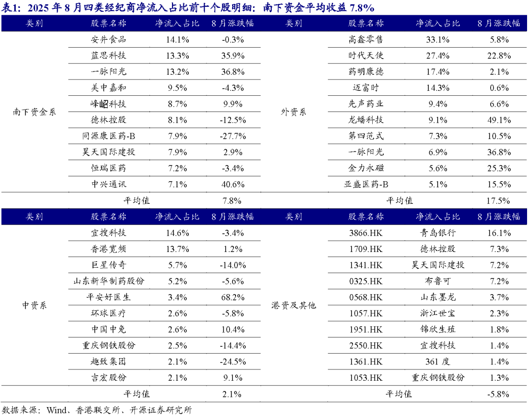 我们对四类经纪商净流入占比居前的十只个股进行收益统计:南下资金经纪商净流入占比居前的十只个股平均收益率7.8%,外资系经纪商净流入占比居前的十只个股平均收益率为17.5%,中资系净流入占比居前的十只个股平均收益率2.1%,港资及其他净流入占比居前的十只个股平均收益率-5.8%。