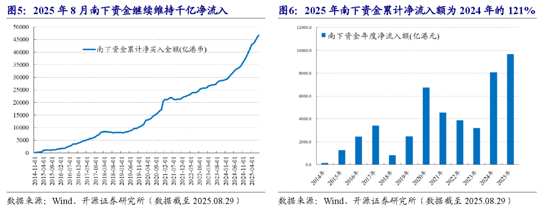 8月南下资金继续维持千亿净流入,单月净流入额达1122亿港元。截至2025年8月29日,南下资金累计净流入额为9790亿港元,是2024年全年的121%,持续创历史新高。