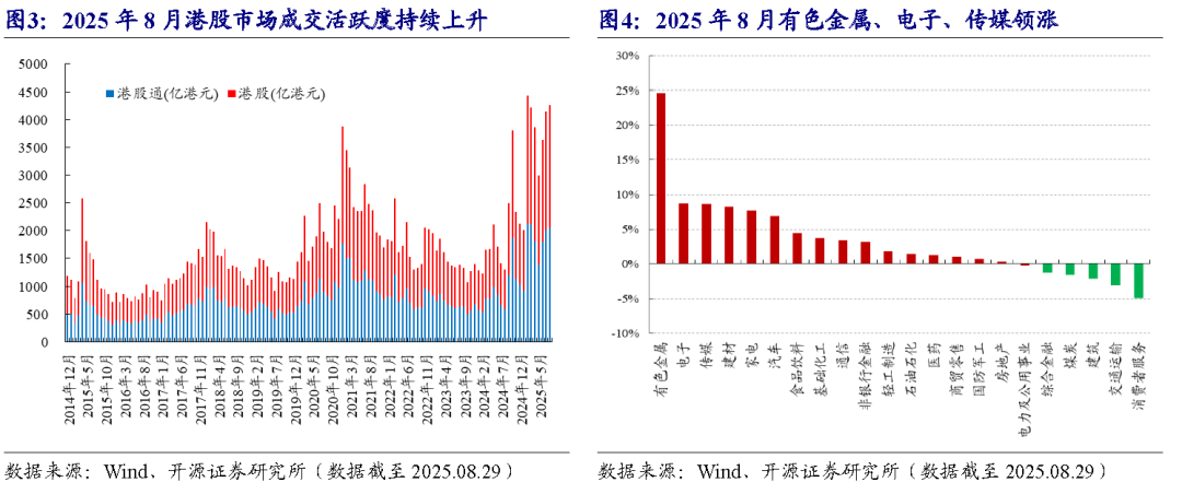 从港股一级行业来看,2025年8月行业分化加剧,其中有色金属、电子、传媒领涨。