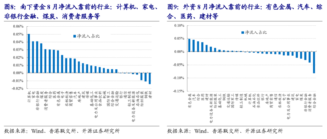 (2)外资:8月净流入靠前的行业为有色金属、汽车、综合、医药、建材;