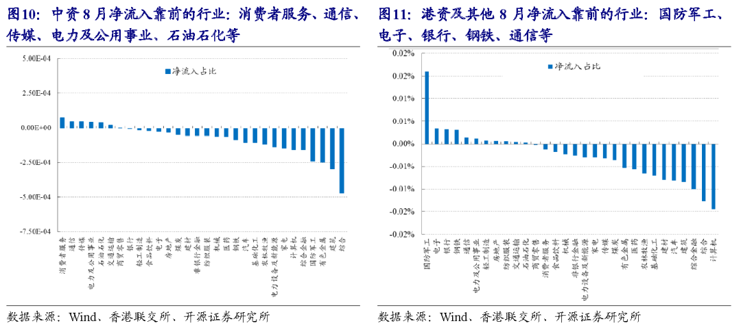 (3)中资:8月净流入靠前的行业为消费者服务、通信、传媒、电力及公用事业、石油石化;