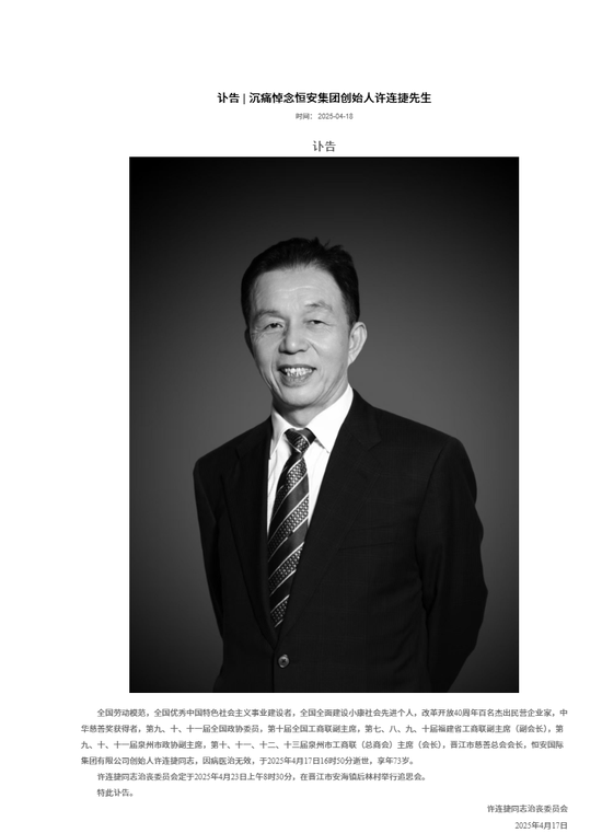 恒安集团官微发布消息称:恒安集团创始人许连捷,因病医治无效,于2025年4月17日16时50分逝世,享年73岁。