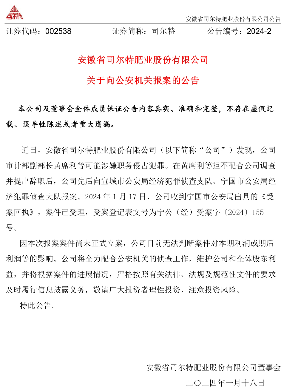 对于上述职务侵占事项,司尔特已于2024年1月进行相关信息披露。公司审计部副部长黄席利等可能涉嫌职务侵占犯罪。在黄席利等拒不配合公司调查并提出辞职后,公司已报案并已受理。
