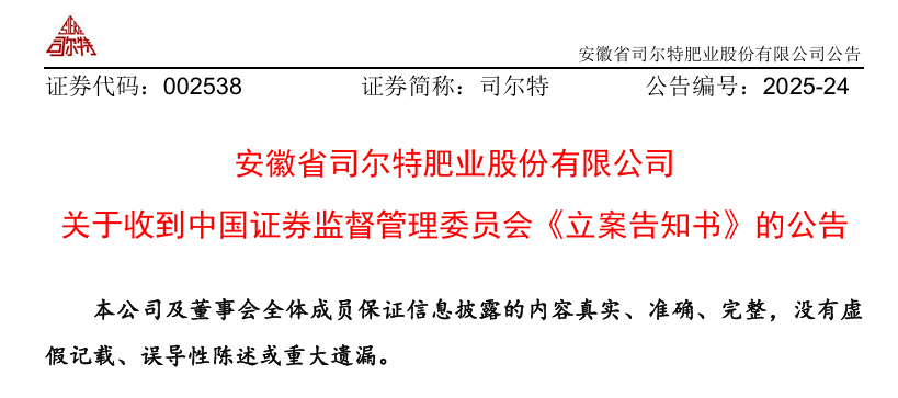 安徽省司尔特肥业股份有限公司(以下简称“公司”)于2025年9月1日收到中国证券监督管理委员会(以下简称“中国 *** ”)对公司送达的《立案告知书》(编号:证监立案字0232025004),公司因涉嫌信息披露违法违规,根据《中华人民共和国证券法》《中华人民共和国行政处罚法》等法律法规,中国 *** 决定对公司进行立案。