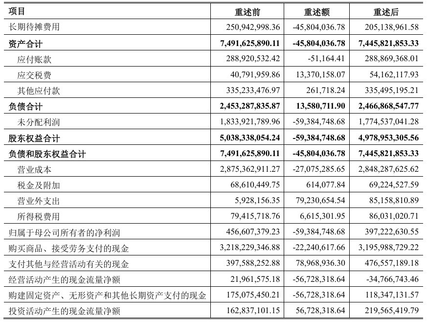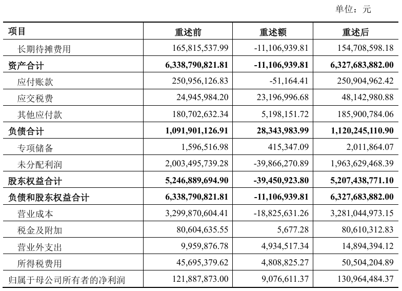 此外,今年5月,公司曾披露关于前期会计差错更正及追溯调整的公告。根据安徽证监局《决定书》的认定,公司对相关报告期财务报表采用追溯重述法进行会计差错更正,对2021年至2023年度财务报表相关项目进行了追溯重述,对财务报表影响项目及更正金额如下: