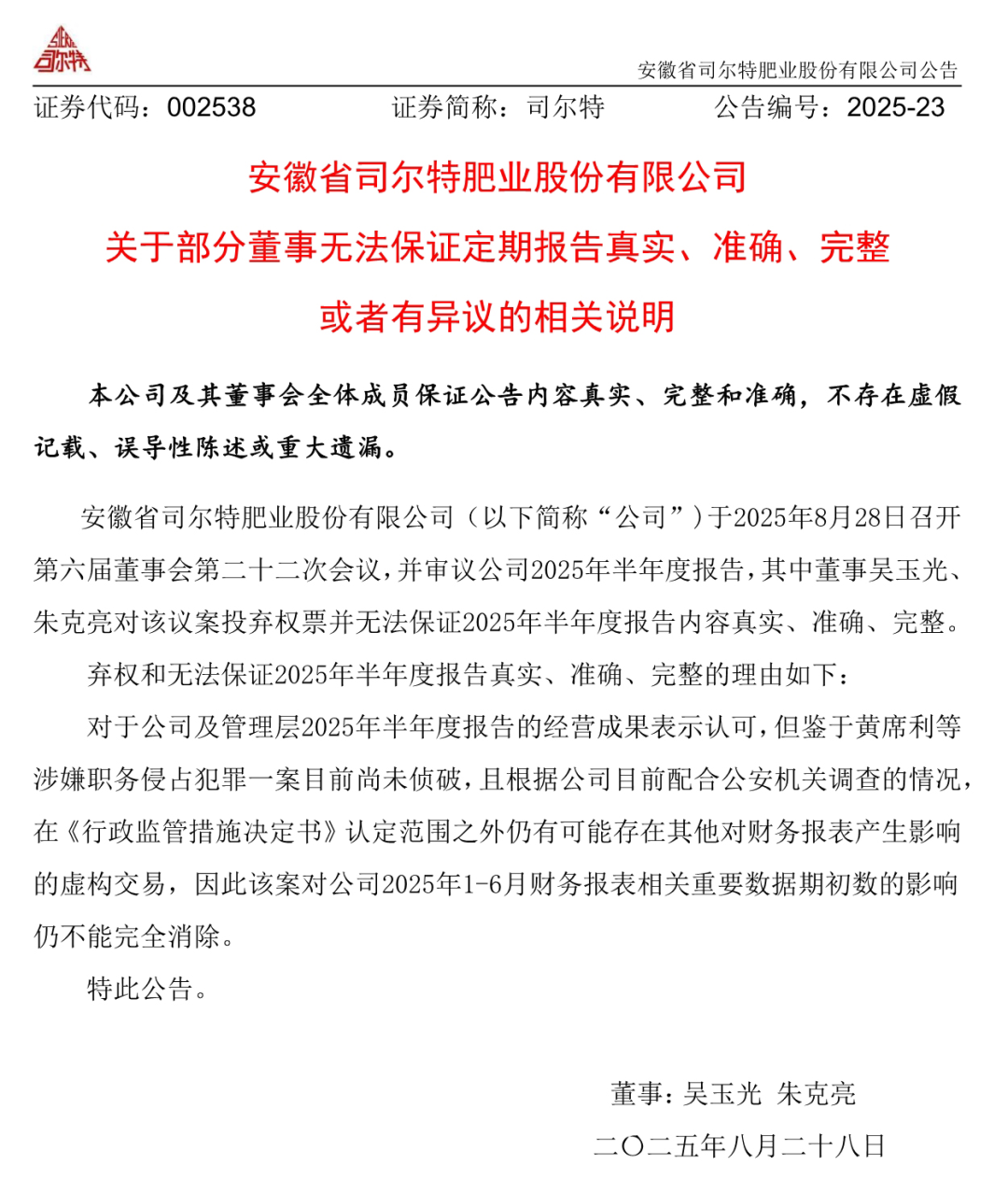 2025年8月30日,公司披露了2025年半年度报告。同日,公司还披露了《关于部分董事无法保证定期报告真实、准确、完整或者有异议的相关说明》。